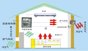 工作原理:智能新風(fēng)系統(tǒng)通過引入室外冷空氣,對機(jī)房溫度進(jìn)行調(diào)節(jié),當(dāng)室內(nèi)溫度達(dá)到22℃(可設(shè)置),室內(nèi)外溫度差△T≥2℃,智能新風(fēng)啟動,向室內(nèi)送入過濾后的冷空氣,室內(nèi)溫度降至18℃(可設(shè)置)時(shí),智能新風(fēng)停機(jī),以此循環(huán)工作。